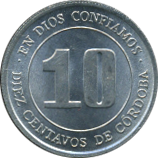 | Wertseite: Wertzahl, Umschrift unten Wertangabe "Diez Centavos de Cordoba" (zehn hunderstel eines Cordoba), oben "En Dios Confiamos" (Wir vertrauen auf Gott). | |||||||||||